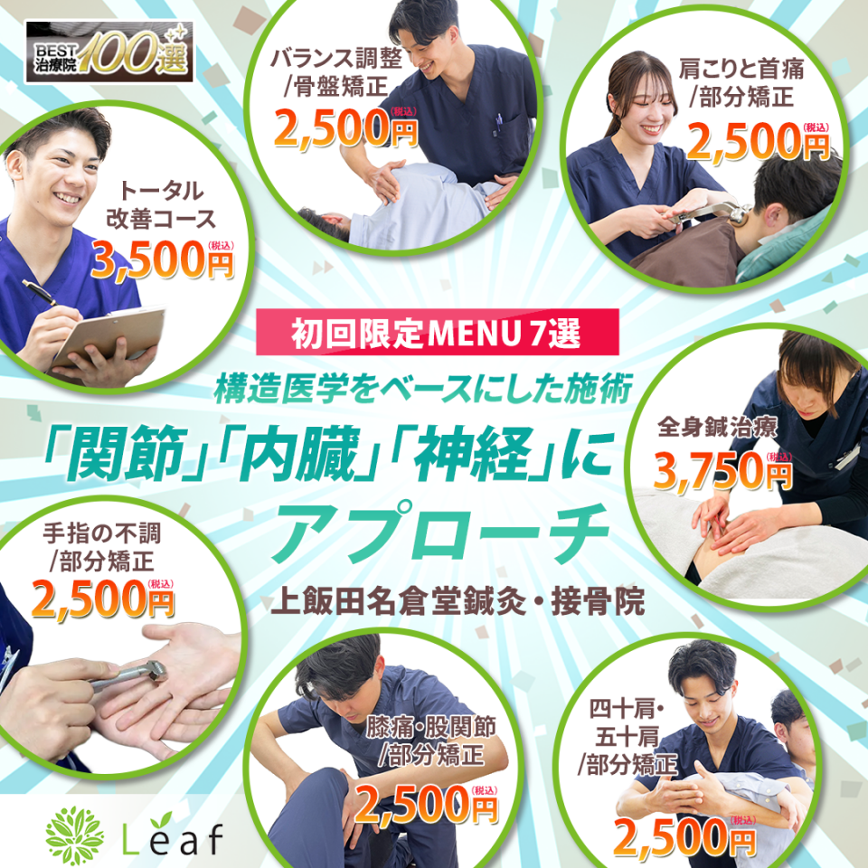 | 膝痛・股関節痛のお悩み改善集中コース/部分矯正 | 2,500円 | 5,100円 |